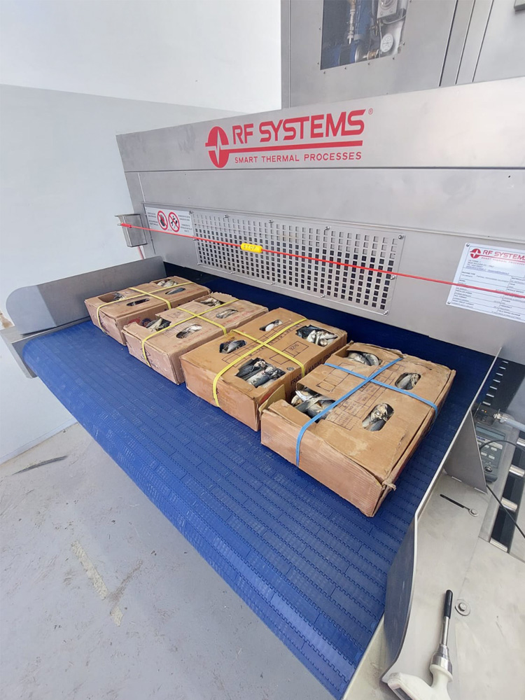 THERIO, the RF Systems’ equipment type designed for defrosting applications, has been chosen by the company that appreciated its features: up to 75 kW RF power with water-cooled generator, PLC for automatic control of RF field intensity, adjustable electrode system for precise energy delivery, continuous conveyorised operation and a compact footprint. The machine is designed for the continuous tempering/defrosting of frozen herrings in cardboard packaging, with a maximum throughput of 1.400 kg/h.