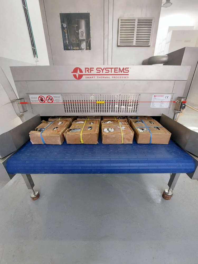 RF Systems supplied a continuous radio frequency defrosting solution operating at 27.12 MHz. RF energy generates heat directly inside the product by acting selectively on its water content, enabling fast and uniform tempering regardless of product size, geometry, or packaging. These featurues avoid surface overheating and temperature gradients typical of conventional defrosting methods.